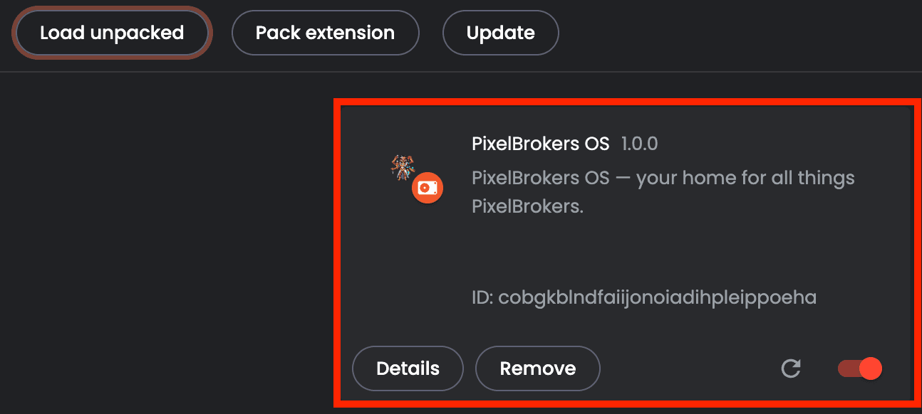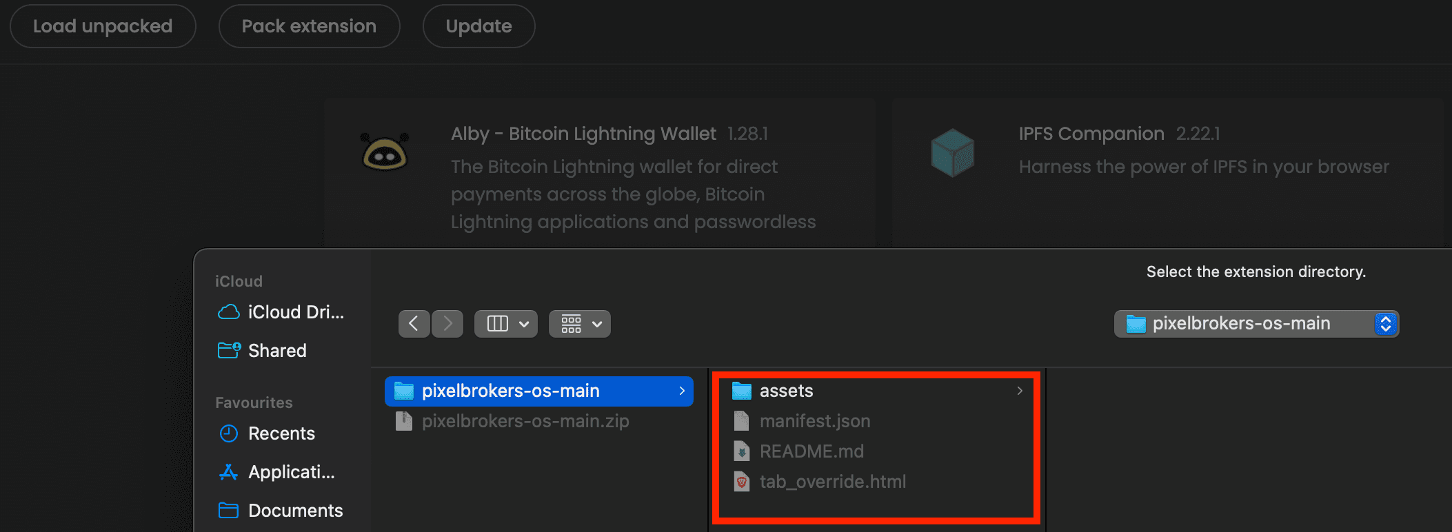 You're at the final stretch! Press the "Load unpacked" option, and then go to the folder where you saved pixelbrokers-os. It should look something like this: