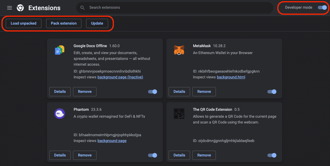 Once you get there you'll see "Developer mode" in the top right. Make sure to toggle that on and then you'll see new options (we're gonna be using "Load unpacked")